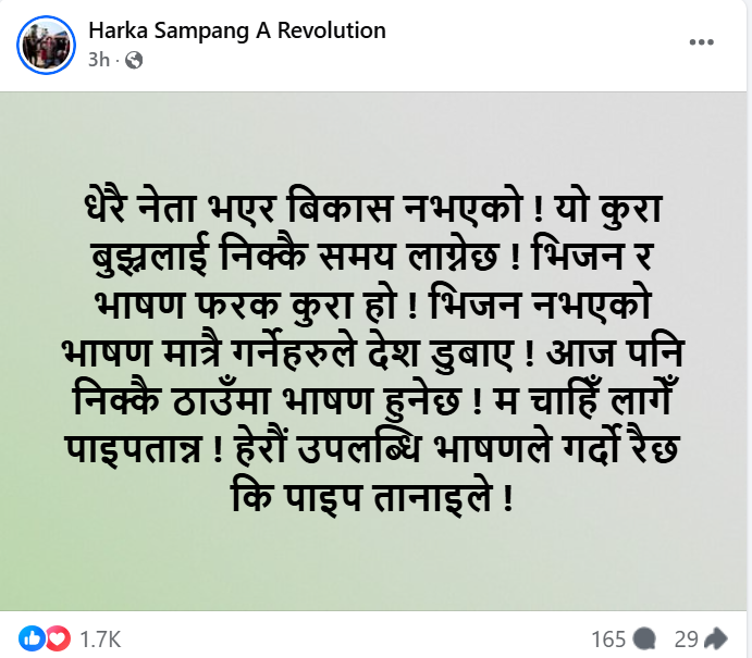 उनले लेखेका छन्, ‘धेरै नेता भएर विकास नभएको कुरा बुझ्नलाई निक्कै समय लाग्नेछ। भिजन र भाषण फरक कुरा हो। भिजन नभएको भाषण मात्रै गर्नेहरूले देश डुबाए। आज पनि निक्कै ठाउँमा भाषण हुनेछ। म चाहिँ लागेँ पाइपतान्न। हेरौँ उपलब्धि भाषणले गर्दो रैछ कि पाइप तानाइले।’