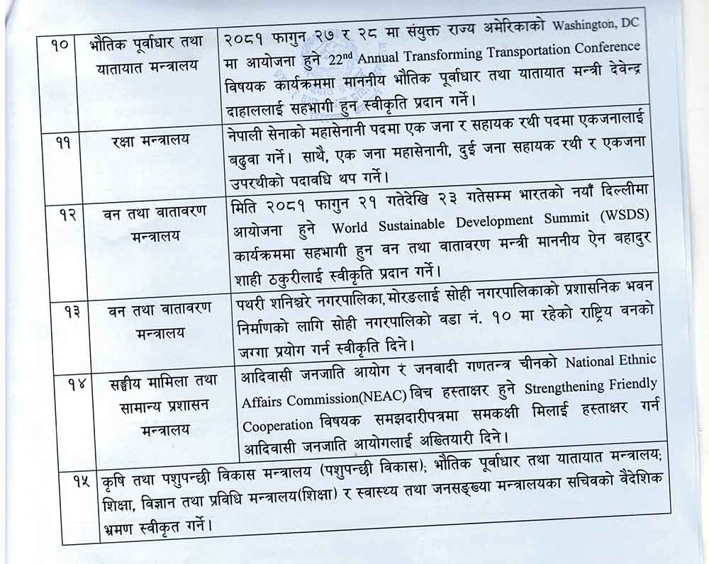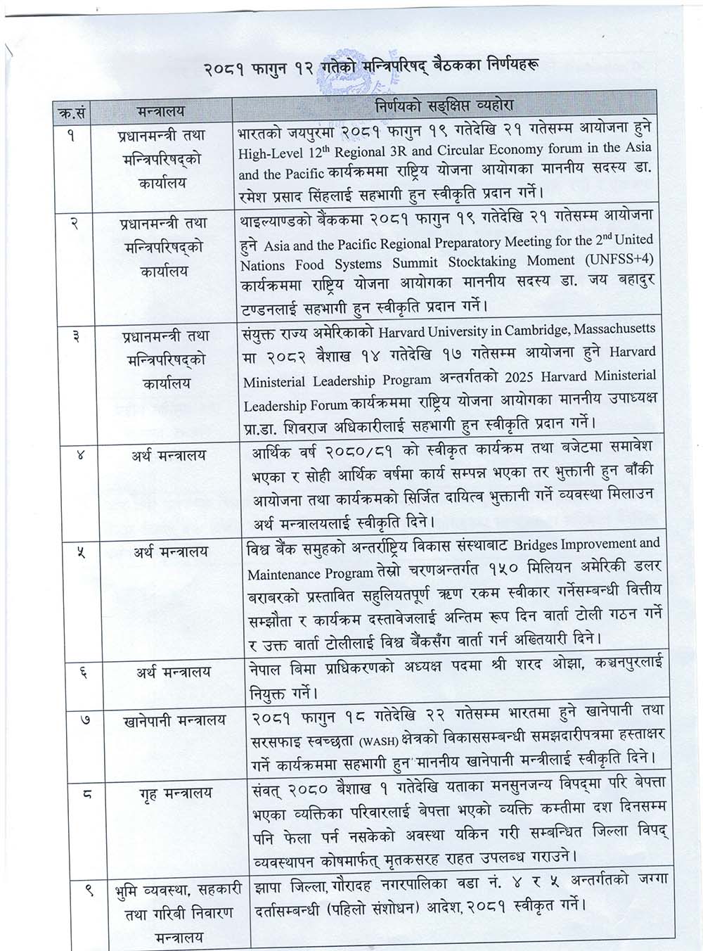 काठमाडौं : मन्त्रिपरिषद्को फागुन १२ गते बसेको बैठकका निर्णय सार्वजनिक गरिएको छ।