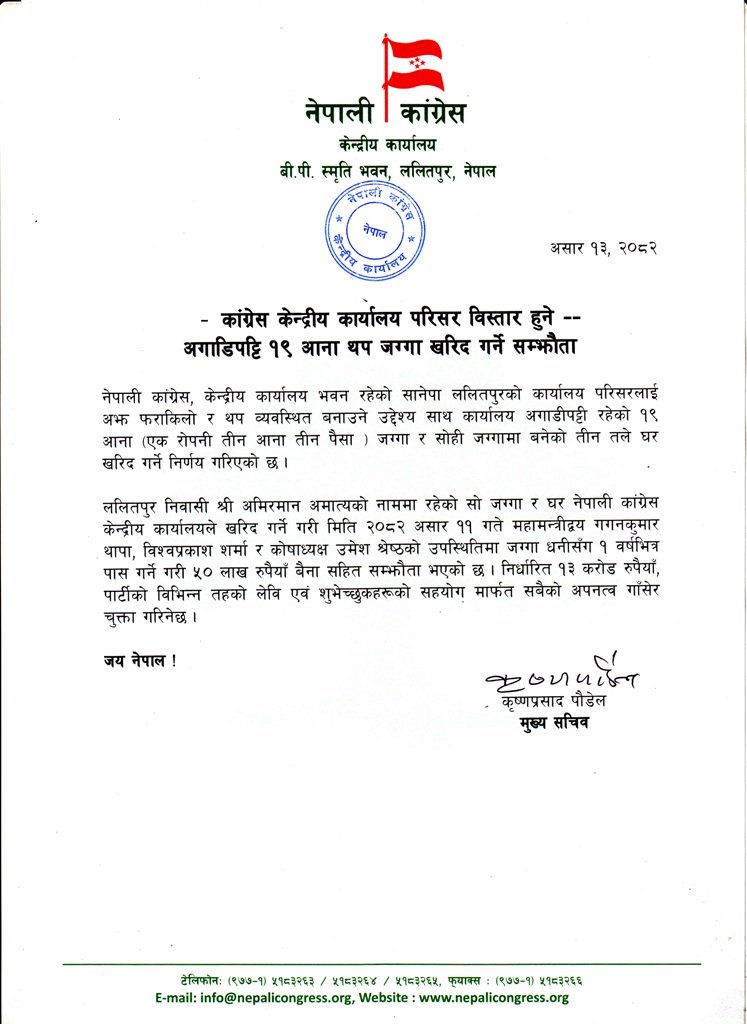 ‘नेपाली कांग्रेस, केन्द्रीय कार्यालय भवन रहेको सानेपा ललितपुरको कार्यालय परिसरलाई अझ फराकिलो र थप व्यवस्थित बनाउने उद्देश्य साथ कार्यालय अगाडिपट्टि रहेको १९ आना (एक रोपनी तीन आना तीन पैसा ) जग्गा र सोही जग्गामा बनेको तीन तले घर खरिद गर्ने निर्णय गरिएको छ,’ पौडेलद्वारा जारी विज्ञप्तिमा उल्लेख छ ।