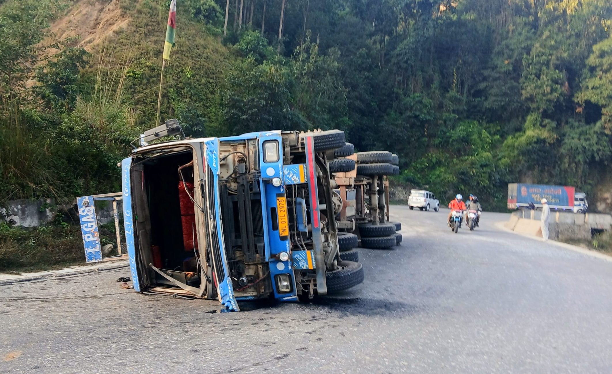 पृथ्वीराजमार्ग अन्तर्गत धादिङको महादेवबेसी नजिकै घुम्ती सडकमा भारतीय नम्बरको ग्यास बोक्ने बुलेट गाडी पल्टिएको हो ।