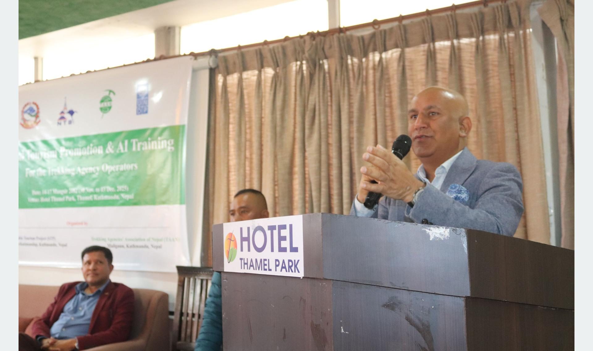 ट्रेकिङ एजेन्सिज् एशोसियसन अफ नेपाल (टान)को आयोजना तथा नेपाल पर्यटन बोर्ड र संयुक्त राष्ट्रसङ्घीय विकास कार्यक्रम (युएनडिपी) नेपालको सहलगानीमा सञ्चालित दिगो पर्यटन परियोजनाको सहकार्यमा आजदेखि सञ्चालित ‘प्रविधिमैत्री पर्यटन तथा एआई तालिम’को उद्घाटन सत्रमा उनले प्रविधिका माध्यमबाट पर्यटन क्षेत्र अहिलेको आवश्यकता भएको बताएका हुन् ।