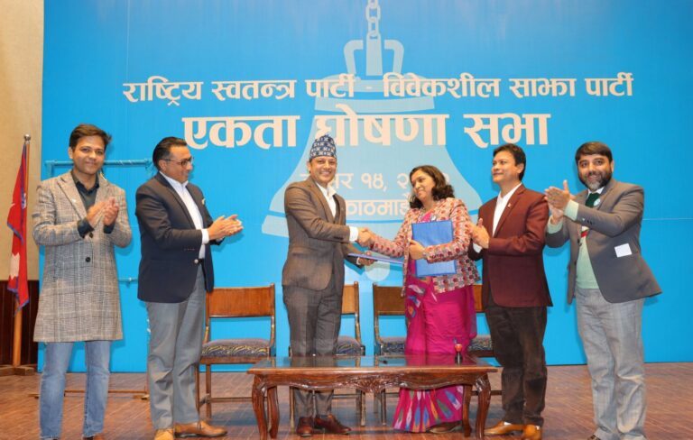 काठमाडौँ : विवेकशील साझा पार्टी र राष्ट्रिय स्वतन्त्र पार्टीबीच एकता भएको छ । दुई दलबीच पाँच बुँदे सहमति भएको छ । सहमतिपत्रमा विवेकशील साझा पार्टीकी अध्यक्ष समिक्षा बास्कोटा र रास्वपाका कार्यवाहक सभापति डिपी अर्यालले हस्ताक्षर गरेका छन् ।