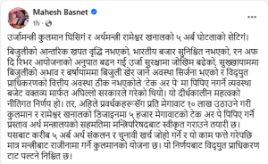 तर, अहिले सोही नीति उल्ट्याउँदै ५ हजार मेगावाटको पीपीए गर्ने तयारी भइरहेको उनले दाबी गरेका छन्। बस्नेतले लेखेका छन्, ‘अहिले प्रवर्द्धकहरूसँग प्रतिमेगावाट १० लाख उठाउने गरी कुलमान र रामेश्वर खनालको डिजाइनमा ५ हजार मेगावाटको ‘टेक अर पे’ पीपीए गर्ने प्रस्ताव अर्थ मन्त्रालयको सहमतिमा मन्त्रिपरिषद्बाट स्वीकृत गराउने तयारी छ।’