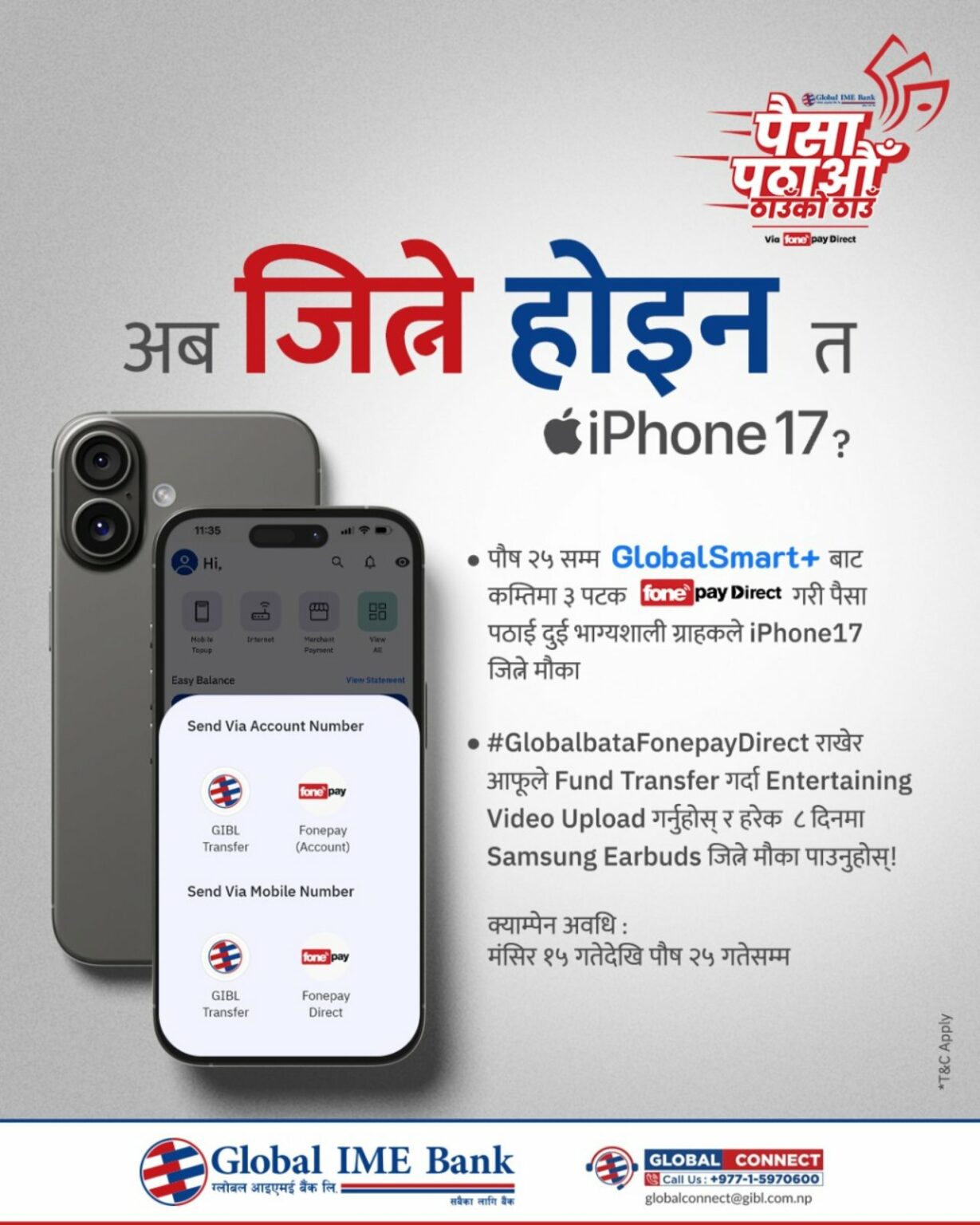 कठमाडौं : ग्लोबल आइएमई बैंक लिमिटेडले बैंकको मोबाइल बैंकिङ्ग–ग्लोबल स्मार्ट प्लसबाट कम्तिमा ३ पटक फोनपे नेटवर्कमार्फत रकमान्तर गर्दा आइफोन १७ जित्ने योजना सार्वजनिक गरेको छ ।