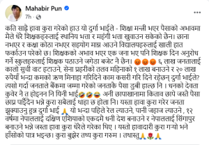 शिक्षामन्त्री पुनले अहिले शिक्षा क्षेत्रमा भोगेको आर्थिक अभावलाई प्रसाईंका दाबीहरूसँग तुलना गरेका छन्। पुनले लेखेका छन् कि पैसा नभएर धेरै शिक्षकलाई स्थानीय भत्ता वा महँगी भत्ता दिन सकिएको छैन। त्यस्तै, छाना नभएका र कक्षाकोठाको अभाव भएका विद्यालयहरू सहयोग माग्न आउँदा पनि आफूले खाली हात फर्काउन परेको तितो यथार्थ उनले सुनाएका छन्। शिक्षकको माग लिएर आउने विद्यालयलाई पठाउनका लागि जगेडा बजेट नै नभएको अवस्था उनले स्पष्ट पारेका छन्।