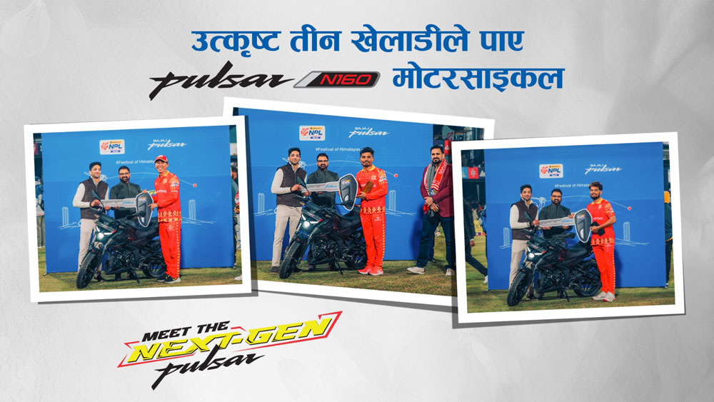 ‘टु ह्विलर पार्टनर’ रहेको गोल्छा ग्रुपअन्तर्गतको हंसराज हुलासचन्द एण्ड कम्पनीले शनिबार एनपीएल दोस्रो संस्करणका तीन उत्कृष्ट खेलाडी रोहितकुमार पौडेल, सन्दीप लामिछाने र शेर मल्ललाई पल्सर मोटरसाइकल (एन१६०) पुरस्कारस्वरुप प्रदान गरेको हो । एनपीएल दोस्रो संस्करणको उपाधि जितेको लुम्बिनी लायन्सका कप्तान तथा सबैभन्दा बढी रन बनाएका रोहितकुमार पौडेलले पल्सर मोटरसाइकल प्राप्त गरे । उनले यस सिजनमा २ सय ७६ रन जोडेका हुन् ।