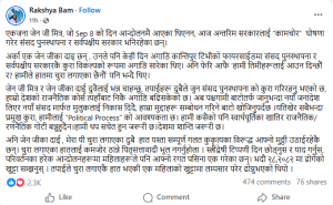‘…चुरा लगाएका हातलाई कमजोर ठान्ने पितृसत्तावादी भूल नगर्नुहोला । स्त्रीद्वेषी टिप्पणी दिन छोड्नुस् र याद गर्नुस्, परिवर्तनका हरेक आन्दोलनहरूमा महिलाहरूले पनि आफ्नो रगत पसिना एक गरेका छन्। भदौ २८,२०८२ मा ढोगेको खुट्टा सम्झनुस् । तपाईँले चुरा लगाएकै हात भएकी एक महिलाको खुट्टामा लम्पसार परेर ढोग्नुभएको थियो ।’, उनले लेखेकी छिन् ।