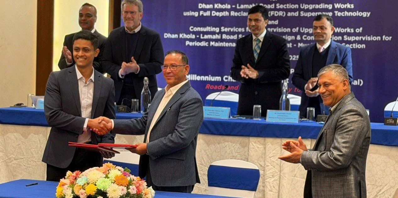 आज एक कार्यक्रमबीच एमसिए-नेपालका कार्यकारी निर्देशक खड्गबहादुर विष्ट र शर्मा-कुमार संयुक्त उपक्रमका आधिकारिक प्रतिनिधि सौरभ शर्माले धान खोलाबाट लमहीसम्मको सडकखण्डको स्तरोन्नति कार्यसम्बन्धी सम्झौता पत्रमा हस्ताक्षर गरे ।रासस