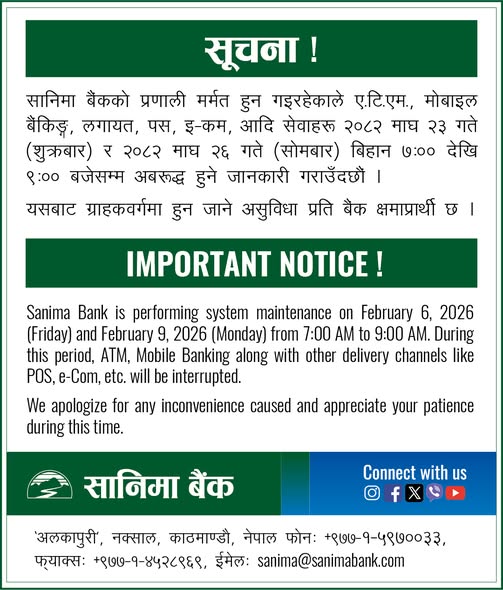 काठमाडौं : सानिमा बैंकको २ दिन बैंकिङ सेवा अबरुद्ध हुने भएको छ ।
