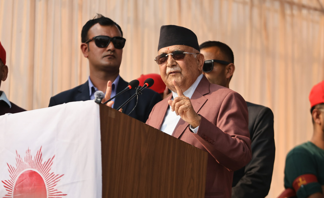 एमाले शान्तिपूर्ण राजनीति र स्थायित्वको पक्षमा रहेको स्पष्ट पार्दै उनले एमालेले अब देशको समृद्ध र विकासका लागि नेतृत्व गर्नुपर्ने विचार रा खे । झापा क्षेत्र नं ५ का प्रतिनिधिसभाका उम्मेदवारसमेत रहेका ओलीले भने, “एमाले बिनाको देश समृद्धिको कल्पना कसैले नगरे हुन्छ, अब देश बनाउन एमालेले अगुवाइ गर्छ ।” सरकारकै सुरक्षा अङ्गलाई सघाउन पार्टीले भोलेन्टियर फोर्स बनाएको उल्लेख गर्दै उनले चुनावका लागि मात्रै नभई दीर्घकालीन रूपमा राष्ट्रको सुरक्षाका लागि यो फोर्स गठन गरिएको बताए ।