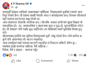 उनले थप लेखेका छन्, ‘आज तपाईंहरूलाई पलपल छट्पटी भइरहँदा म निदाउन सकिनँ, बेचैन छु । यसबेला हाम्रो सजगता चाहिन्छ, धैर्य चाहिन्छ ।’ उनले विवेक, धैर्य र साहसको कामना समेत गरेका छन् । मध्यपूर्वका मुलुकहरु भूराजनीतिक चेपटामा परेको भन्दै ओलीले लेखेका छन्, ‘ती देशहरू पनि पक्कै युद्ध चाहँदैनथे । तर शक्तिको स्वार्थ घुसेपछि विवश हुनुपर्ने ।’