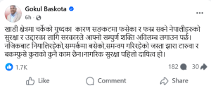काठमाडौं : नेकपा एमालेका नेता गोकुल बाँस्कोटाले मध्यपूर्वमा युद्धका कारण सङ्कटमा परेका नेपाली नागरिकको उद्धारका लागि सरकारलाई तत्काल सक्रिय हुन आग्रह गरेका छन्।