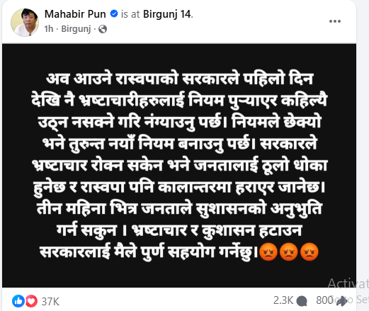 सामाजिक सञ्जालमार्फत आफ्नो धारणा सार्वजनिक गर्दै पुनले आगामी सरकारले कार्यभार सम्हालेको पहिलो दिनदेखि नै भ्रष्टाचारीहरू विरुद्ध आक्रामक रूपमा प्रस्तुत हुनुपर्ने बताएका छन् । उनले लेखेका छन्, ‘रास्वपाको नेतृत्वमा बन्ने वा सहभागी हुने सरकारले कानुनी प्रक्रिया पुर्याएर भ्रष्टाचारीहरूलाई कहिल्यै उठ्न नसक्ने गरी कारबाहीको दायरामा ल्याउनुपर्छ ।’