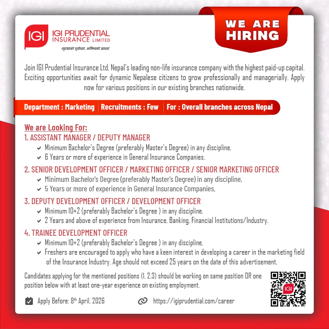 काठमाडौं : आइजिआई प्रुडेन्सियल इन्स्योरेन्स कम्पनीले कर्मचारी माग गरेको छ ।